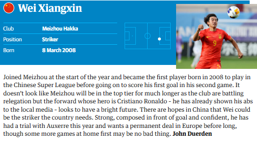 短时间内,他成为中国各级青年国家队的常备主力,同时以唯一一名中国球员的身份,入选《卫报》评选的全球最佳年轻球员榜单。