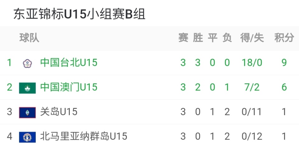 B组最终积分情况:中国台北3战3胜进18球丢0球积9分获得第一,中国澳门3战2胜1负积6分第二,而关岛队积1分第三,北马里亚纳群岛队积1分垫底。