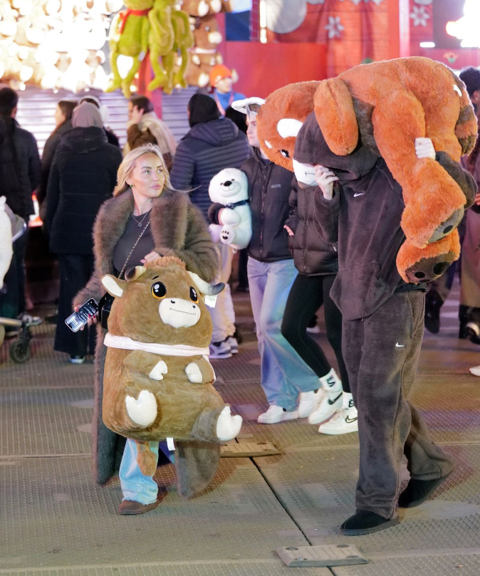 奥利维亚在冬季嘉年华上十分吸睛,怀里抱着一只巨大的毛绒公牛和泰迪熊,看起来像是帕尔默为她赢得的奖品。