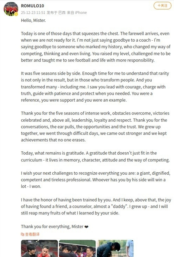 最近,罗慕洛刚刚深情告别了成都蓉城主教练徐正源,他在文中表示,徐正源像自己的父亲,并称他是可以改变自己足球生涯的人,徐正源的离开让自己很伤心,对他只有感恩。由于之前罗慕洛就在今年7月份的发布会上公开力挺徐正源,披露俱乐部矛盾,他的未来也充满未知数。