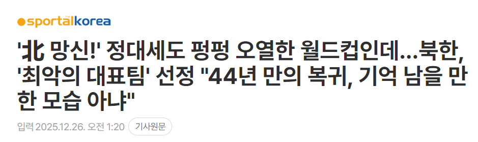 韩国媒体Sportal Korea在26日指出,朝鲜队跻身这份“不光彩”的榜单。事实上,朝鲜队出征南非世界杯时曾豪情万丈,喊出“复刻 1966年荣光,朝鲜必胜”的口号,立志重现1966年英格兰世界杯杀入八强的传奇战绩。彼时的朝鲜队阵容堪称豪华:拥有效力于俄罗斯劲旅罗斯托夫足球俱乐部的洪英袓、在韩国水原三星蓝翼队踢球而被韩国球迷熟知的郑大世,以及被誉为亚洲顶级门将的李明国等一众强将。