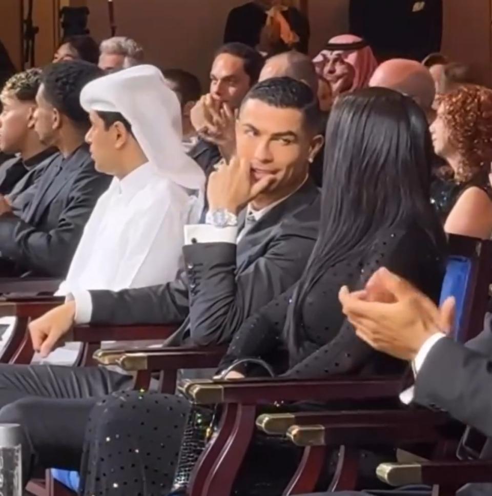 坐在VIP座席上观看颁奖的C罗,还被发现了有趣的一幕。他先是用胳膊碰了碰正在盯着舞台的乔治娜,等到未婚妻看向他时,他随即挤了挤眼睛,很是顽皮的感觉,进而也被网友们评论称,他是在跟乔治娜调情,“看来今晚有人没法睡觉了。”