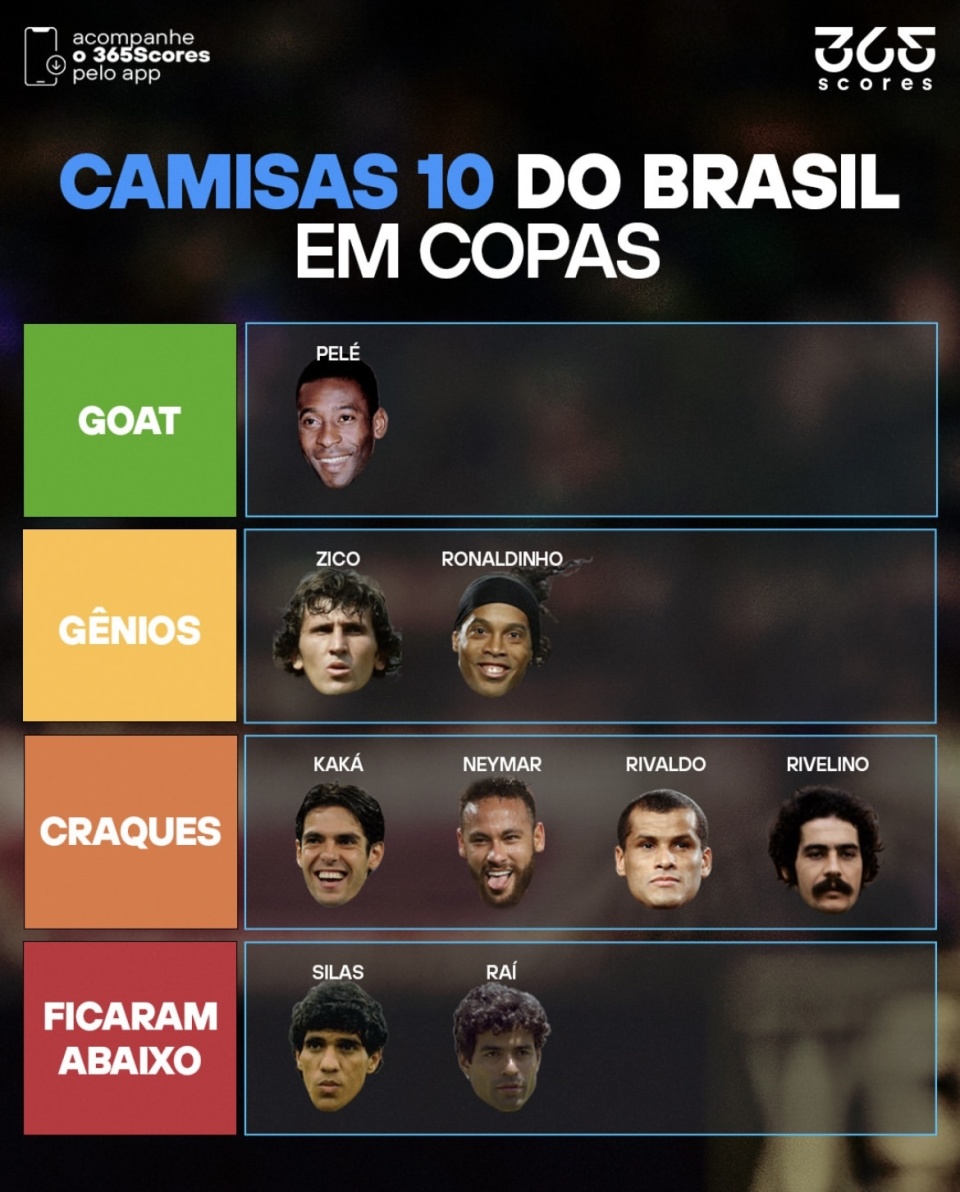 最近365scores发布了“巴西世界杯10号分档”榜单,贝利被单独放进历史最佳一档,济科、小罗被归到“天才”,里瓦尔多、卡卡、内马尔这些名字则被放在“球星”。但同样是聊世界杯10号,这份名单里却没看到济济尼奥、平加这些更早一代的10号,分档也把“冠军背书”和“个人表现”搅在了一起:有人数据更亮却没往上走,有人名气更大却卡在中间。