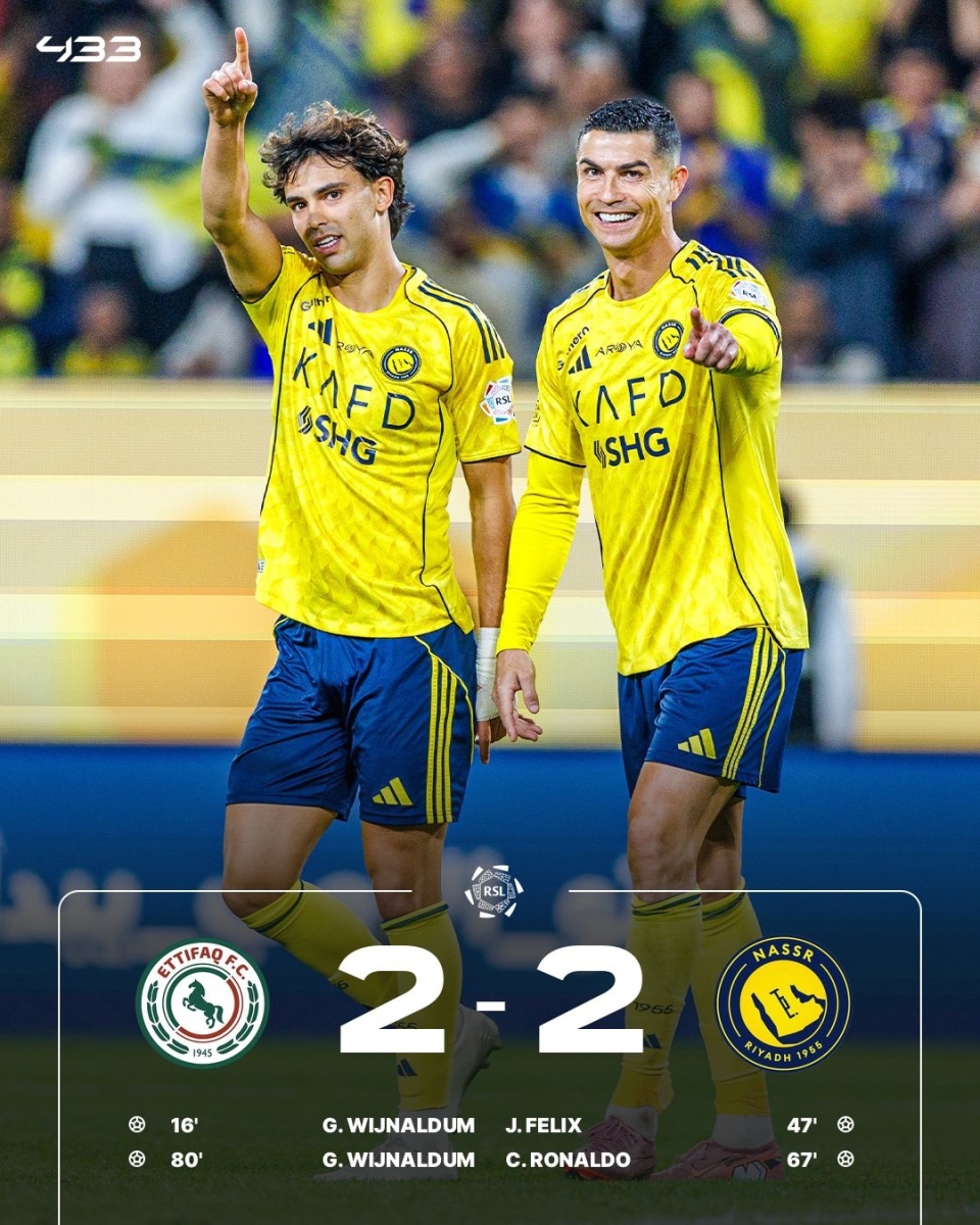 沙特联第12轮,利雅得胜利客场2-2战平达曼协作,开局10连胜终结3分领跑。维纳尔杜姆抽射破门首开纪录,哈纳姆远射中楣,安吉洛助攻菲利克斯扳平比分,菲利克斯助攻C罗破门反超,打入生涯第957球,维纳尔杜姆抽射扳平。【详情】