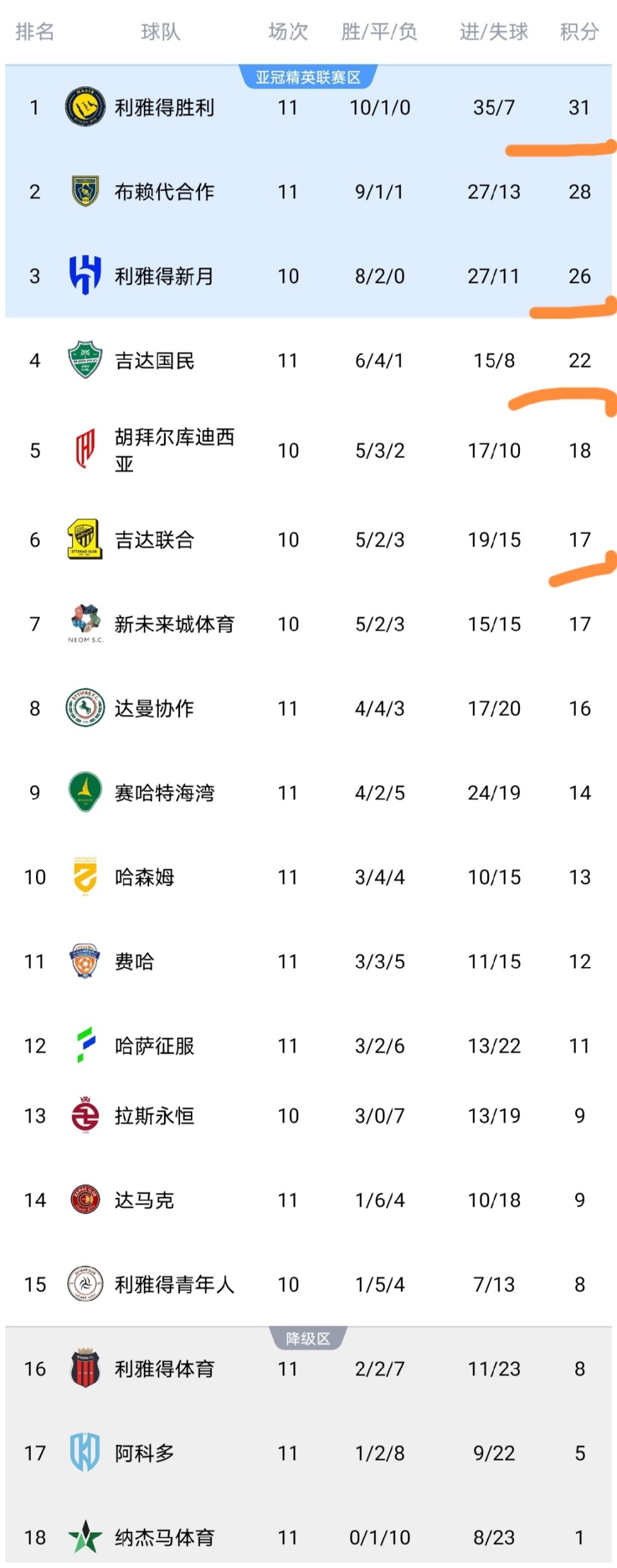 沙特联最新积分榜情况:可以看到利雅得胜利队依然保持不败,虽然今天凌晨丢了2分,但是积分已经超过了30分,比第二的布赖代合作队多了3分,同时比第三的利雅得新月多了5分,当然利雅得新月少赛一场。此外利雅得胜利比吉达国民多了9分,比吉达联合多了14分。可以看到本赛季吉达联合和吉达国民都无法跟利雅得胜利争冠了,只有利雅得新月和布赖代合作目前具备跟利雅得胜利争冠的势头。