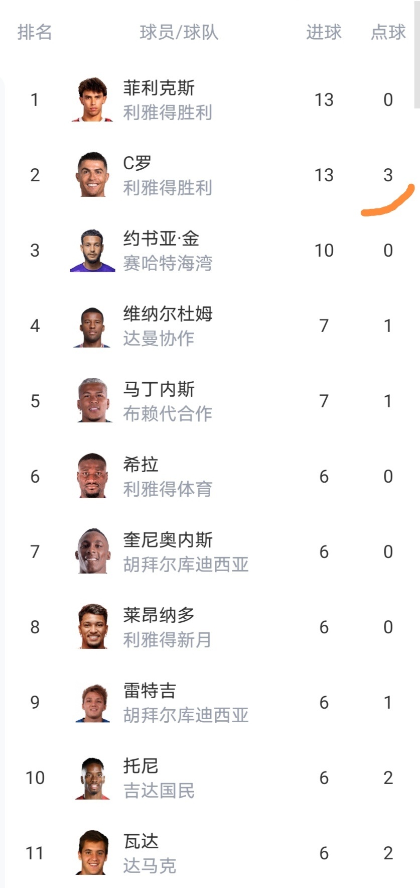 沙特联最新射手榜情况:本轮取得进球之后,C罗进球数达到了13个,场均进球超过了1球,进球效率杠杠滴,不过菲利克斯似乎比C罗更为出色,金靴争夺也是很激烈的,不知道菲利克斯最后会不会成全C罗,让C罗拿金靴。