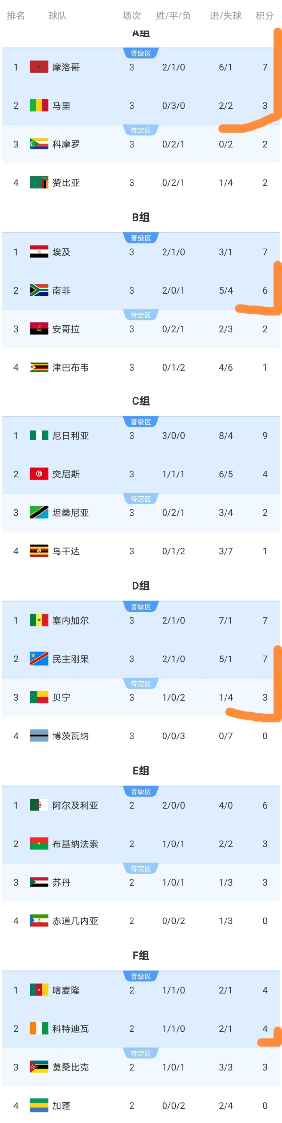 非洲杯小组赛最新积分榜情况:可以看到A组的摩洛哥、马里已经确定晋级,科摩罗和赞比亚已经出局,B组的埃及和南非已经确定晋级,安哥拉和津巴布韦已经出局。C组的尼日利亚、突尼斯、坦桑尼亚已经晋级,乌干达出局。D组的塞内加尔、民主刚果、贝宁已经晋级,博茨瓦纳出局。此外E组的阿尔及利亚、布基纳法索、苏丹已经确定晋级,赤道几内亚出局,F组的喀麦隆、科特迪瓦、莫桑比克也已经确定晋级,加蓬出局。