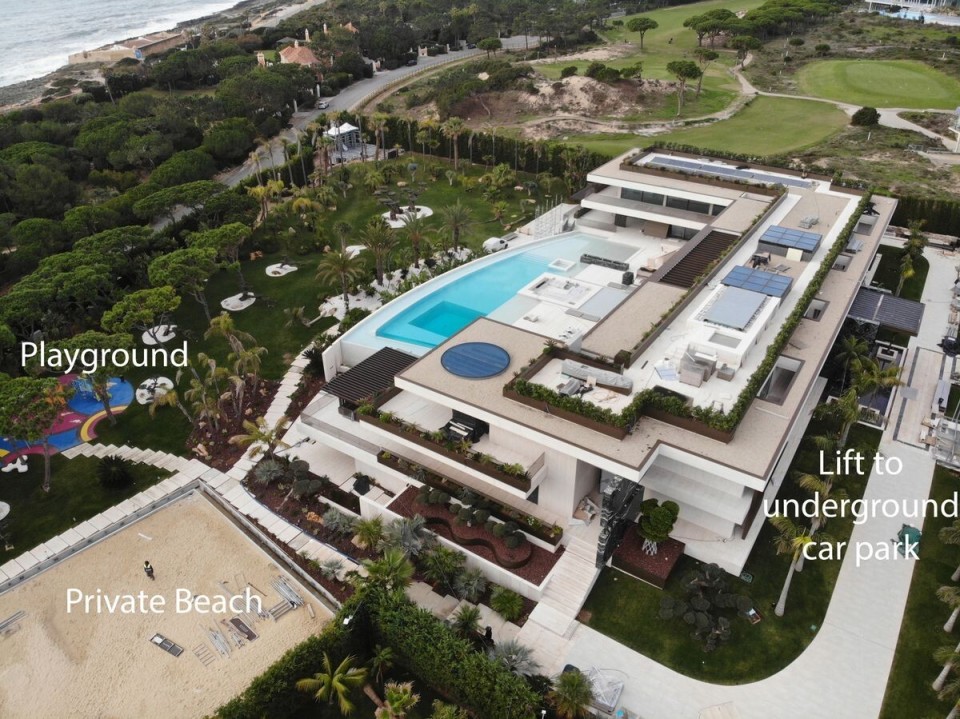 身价估计约14亿英镑的C罗与伴侣乔治娜,将可享用多项高端配置,包括智能供暖系统、健身房、室内与室外泳池、按摩室以及私人影院。住宅内还设有供五个孩子使用的游乐区,家人可在私人海滩上休闲放松。豪宅内部大量使用意大利大理石,配备纯金水龙头,并设有一幅专为二人定制的路易威登壁画。
