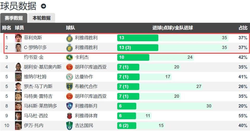 在沙特超本赛季的射手榜上,菲利克斯和C罗以13球并列第一,并有3球的领跑优势,菲利克斯的13个进球不含点球,C罗的13个进球含有3个点球,C罗是利雅得胜利的第一点球手。