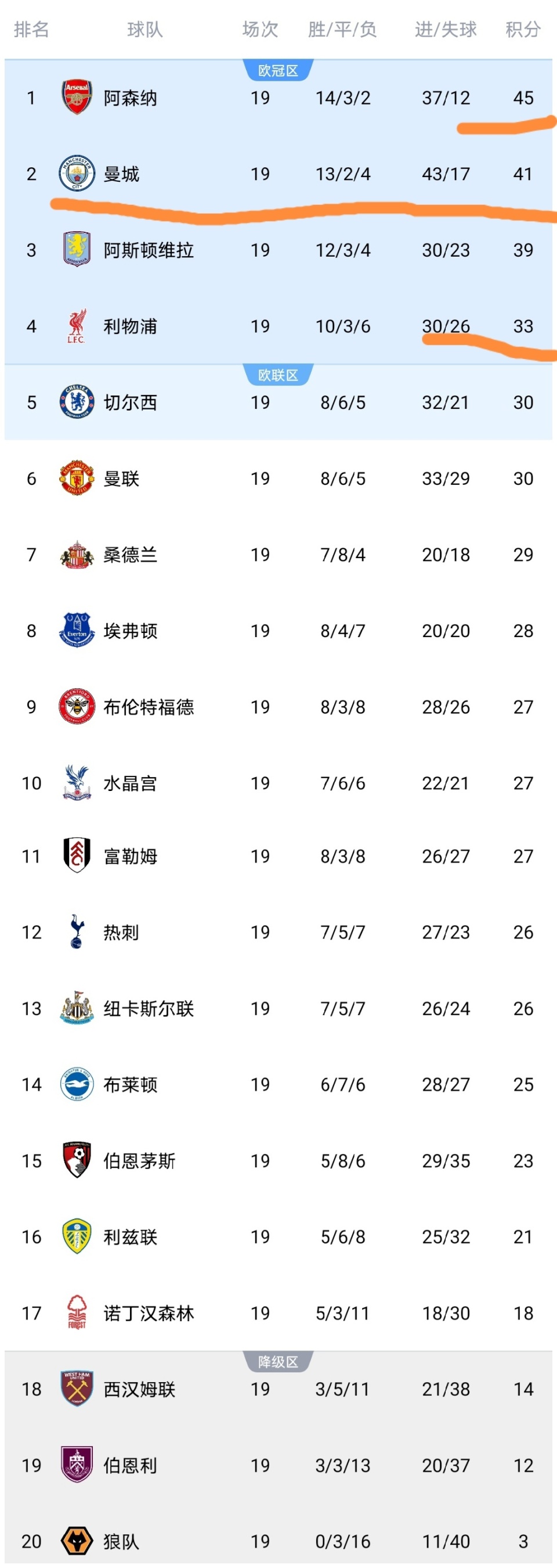 今天凌晨,英超第19轮结束了最后4场较量,曼城、热刺、利物浦、水晶宫等队出战,比赛结束之后,英超所有球队都已经踢完了前19轮的比赛,英超积分榜得到更新,我们来看看英超19轮过后积分榜情况。
