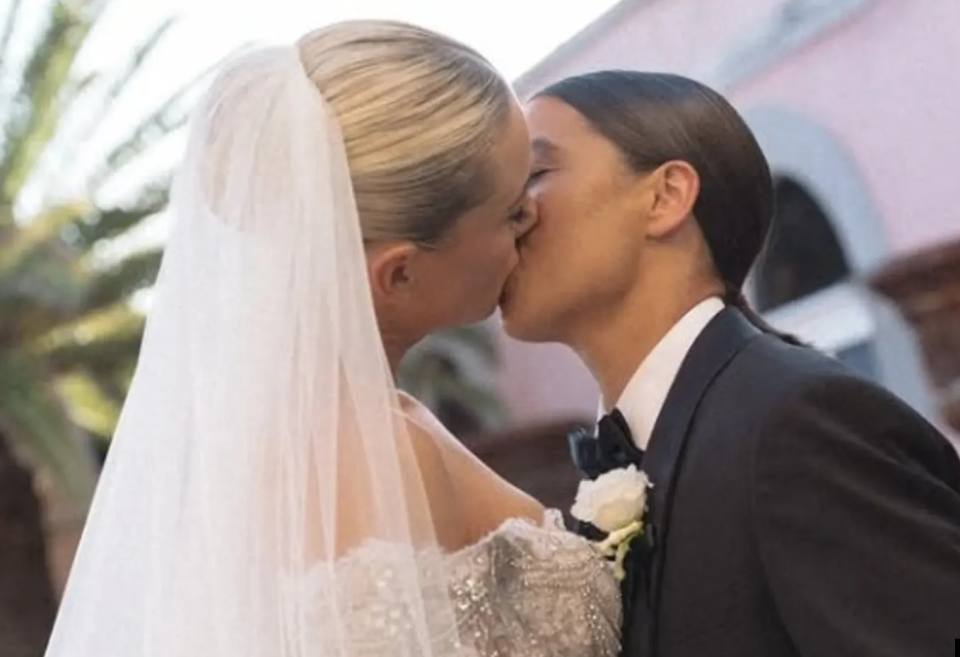 这两位女球员的婚礼,被球迷们称为是“足球界的皇室婚礼”。澳大利亚国家女足的队长科尔身穿黑色单排扣燕尾服,在社媒上发布自己亲吻穿着白色婚纱的梅维斯的照片,并配文“老婆”。