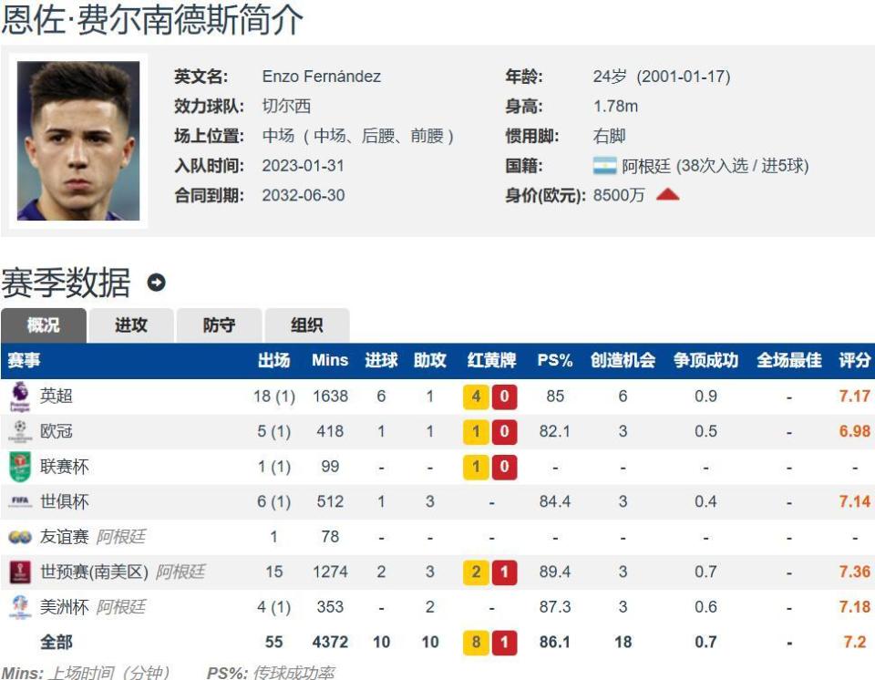 恩佐现年24岁,当打之年,右脚球员,能踢中场中路的多个位置,与切尔西的合同至2032年,与凯塞多是球队的双核。恩佐本赛季至今出战了19场英超的比赛,其中18次首发,贡献6球1助;欧冠出场6次,其中5次首发,贡献1球1助。
