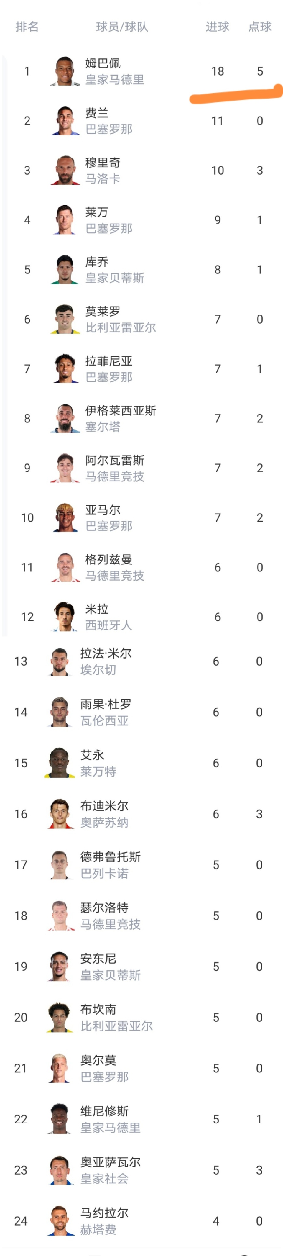 射手榜:虽然姆巴佩目前伤缺,而且要伤缺一段时间,但是目前来看,姆巴佩射手榜第一的宝座相当稳,其他球员很难赶得上,再让个四五轮其他球员恐怕也无法超越姆巴佩。