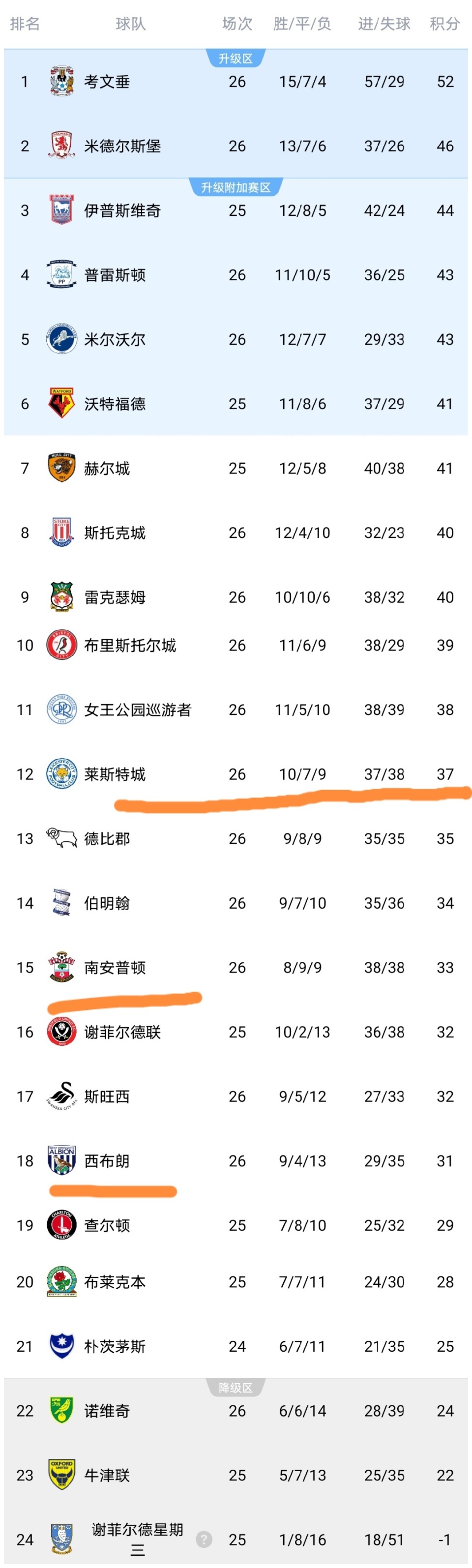 在莱斯特城2-1绝杀西布朗之后,莱斯特城队目前的战绩是10胜7平9负,进37球丢38球,积37分。可以看到莱斯特城队胜率不高啊,而且进球数比失球数少,可见英冠竞争非常激烈。可以看到莱斯特城目前的排名不够理想,距离直接升级区分差9分,但是仅差升级附加赛区4分。可以说莱斯特城队打入升级附加赛区的希望还是很大的。而西布朗排名更加不理想,他们想回英超估计更难了。目前领跑的是兰帕德执教的考文垂队。