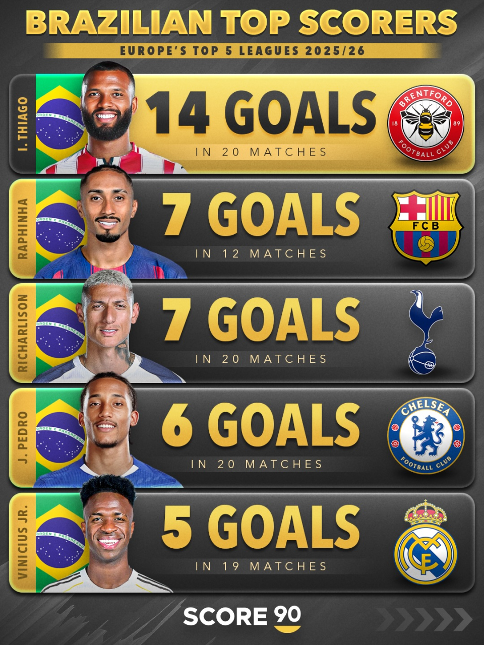 五大联赛巴西射手榜第一!领先维尼修斯9球!