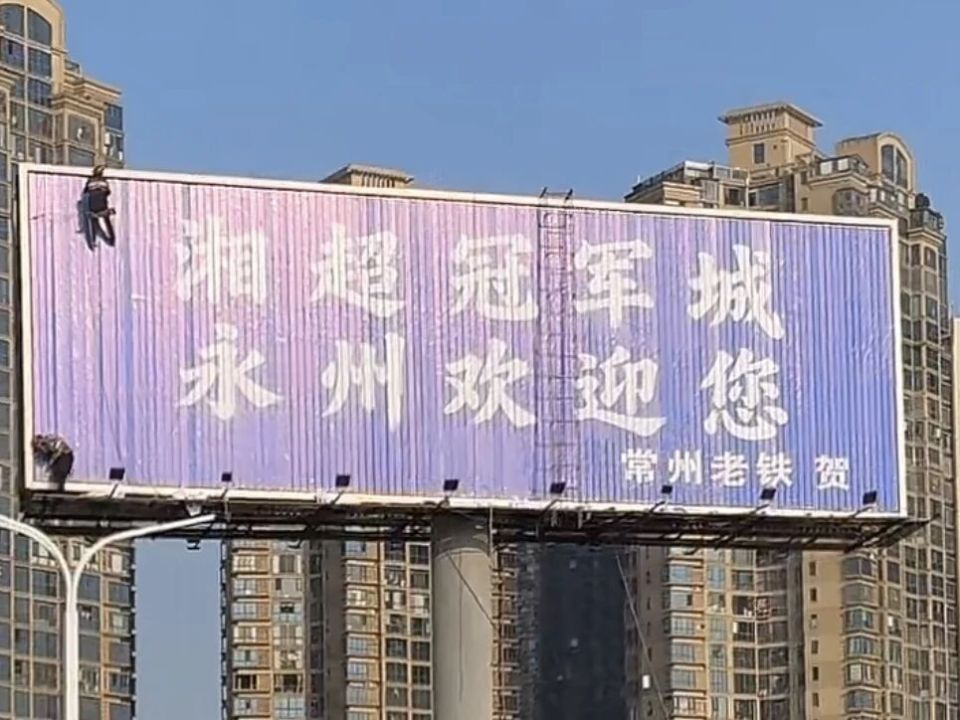 连日来,湖南永州市宋家洲大桥桥头的广告牌,成了江苏网友祝贺永州队“湘超”夺冠,表达对永州喜爱的“示爱牌”。