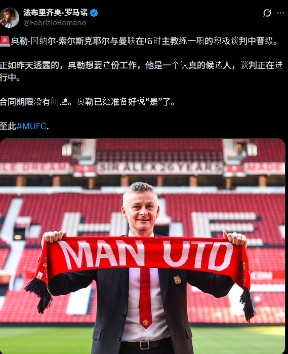 并且转会名记罗马诺也在社媒上确认:“索尔斯克亚与曼联围绕看守主教练一职的沟通正朝着积极方向推进。索尔斯克亚本人明确表达了执教意愿,他也是目前极具分量、被认真考虑的候选人之一,相关谈判正在持续展开。在合同年限问题上,双方并未遇到障碍,索尔斯克亚已经做好随时接受任命的准备。”