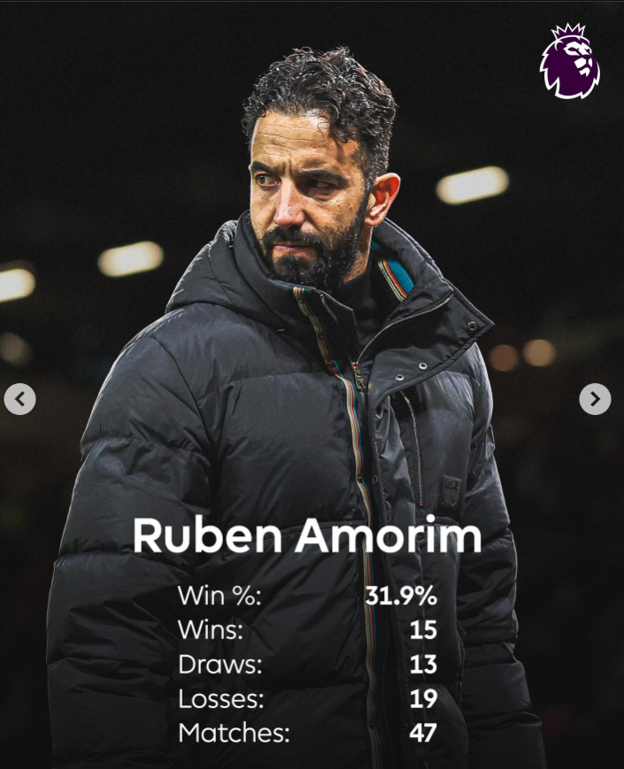 当然数据层面也不漂亮。他在曼联的最终胜率为31.9%,成为英超时代胜率最低的红魔主帅。
