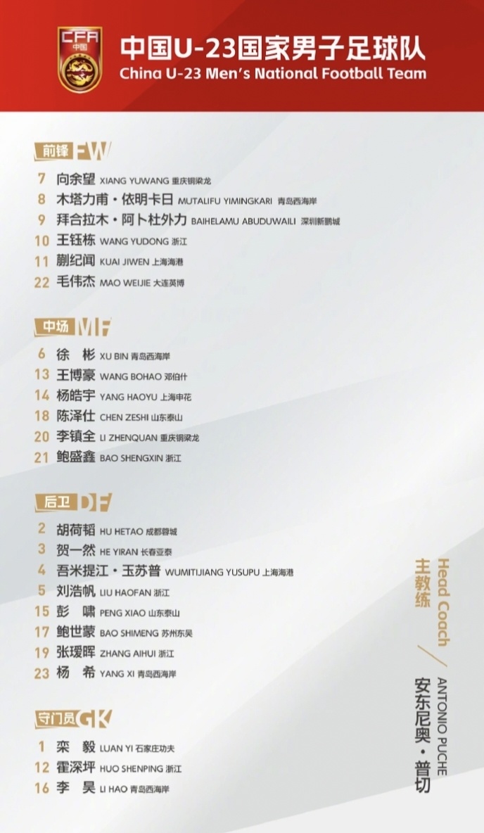 自2014年U23亚洲杯创办以来,中国队在5届赛事中均未能小组出线,15场比赛仅取得2胜13负的惨淡战绩,其中3次以“3连败”垫底出局。但本届U23男足被普遍认为是近十年最具竞争力的一代,阵容中超过80%的球员拥有稳定中超出场经验,王钰栋、拜合拉木、蒯纪闻等7人已入选成年国家队,全队总身价突破800万欧元,创历史新高。