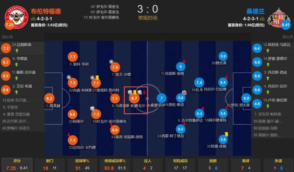 英超第21轮,布伦特福德3-0桑德兰,伊戈尔-蒂亚戈首发出战,上演梅开二度,赛后获得全场最高的8.7分。