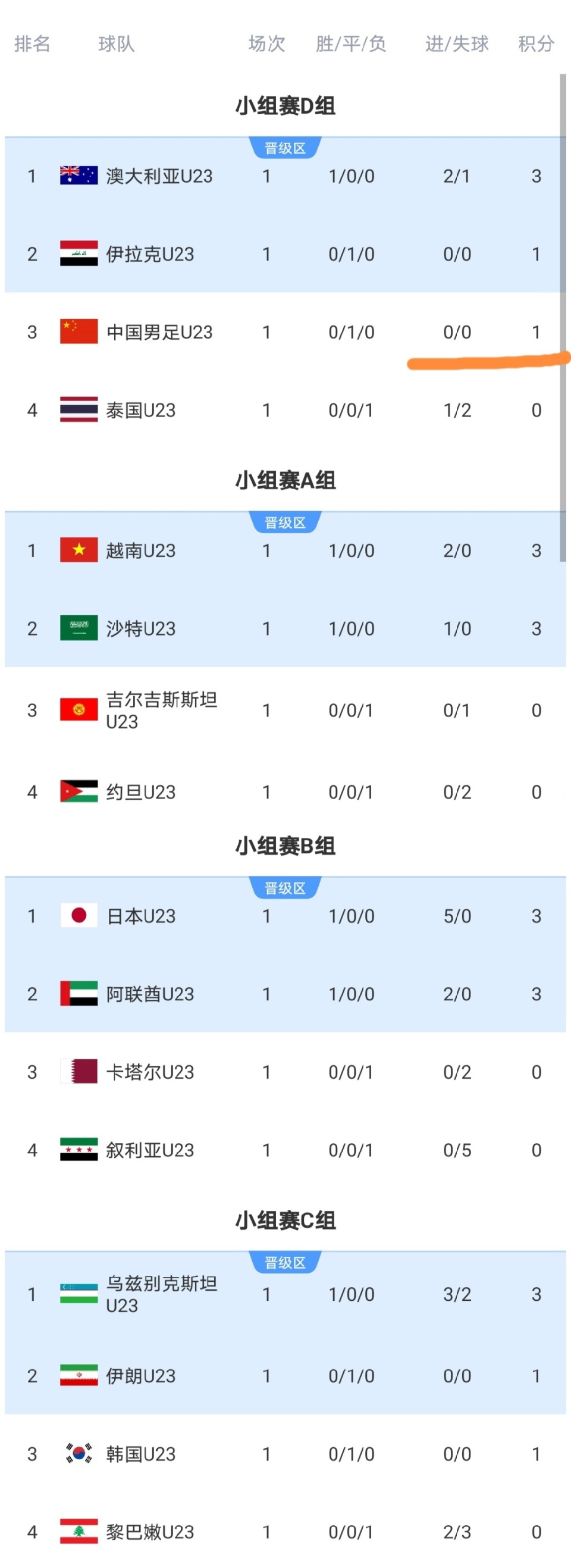 今晚,U23亚洲杯小组第一轮又结束了2场比赛,在这2场比赛结束之后,小组赛第一轮的比赛全部结束,我们来看看小组赛第一轮结束之后完整的积分榜情况。