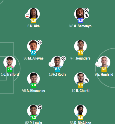 中场休息之后,阿克、罗德里、哈兰德被换下,塞梅尼奥继续留在场上。比赛的第49分钟,与队友二过一配合之后,塞梅尼奥左路精准横传,为刘易斯送出了助攻。