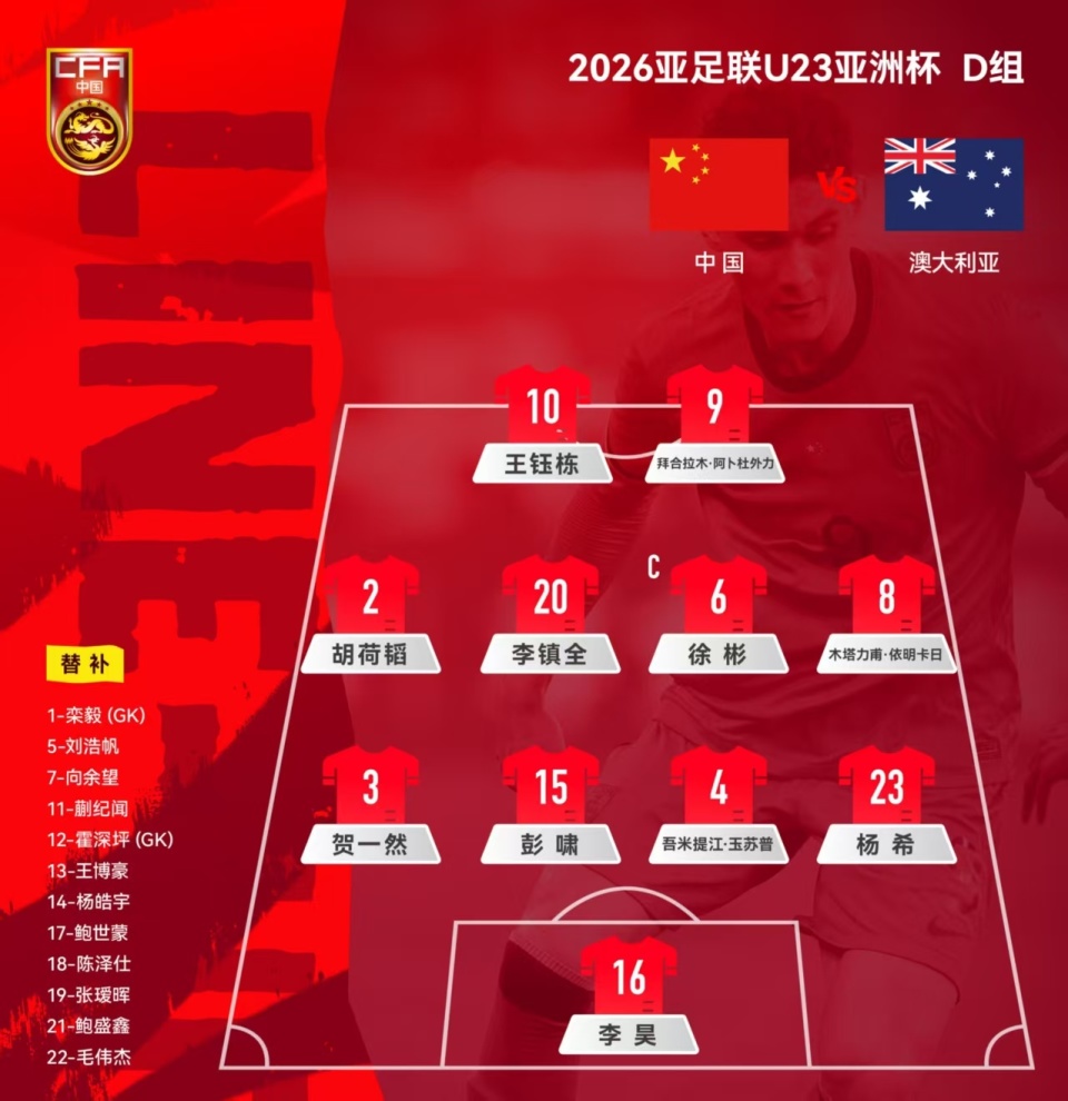 这场和澳大利亚U23的比赛对于U23国足能否从小组出线至关重要,主教练安东尼奥继续以442阵容出战,门将依旧是李昊,左后卫贺一然,右后卫杨希,两个中卫分别是彭啸和玉苏普,4个中场分别是胡荷韬、李镇全、徐斌和木塔力甫,王钰栋与拜合拉木搭档锋线。与首战伊拉克相比,首发阵容有两处改变,杨希和木塔力甫分别取代鲍世蒙和王博豪首发出场。U23国足首发11人平均年龄20.8岁,总身价538万欧元,澳大利亚U23首发11人平均年龄同样是20.8岁,总身价265万欧元,差不多只有U23国足的一半。