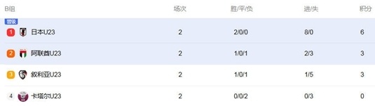 前两轮过后,B组积分榜:日本队两战全胜6分领跑,阿联酋、叙利亚同积3分,卡塔尔两战全败0分垫底。末轮,卡塔尔对阵日本队,阿联酋迎战叙利亚,阿联酋和叙利亚必有一支球队会拿分,因此卡塔尔队即便战胜日本队也无法跻身前二,这意味着他们已经提前一轮小组出局!