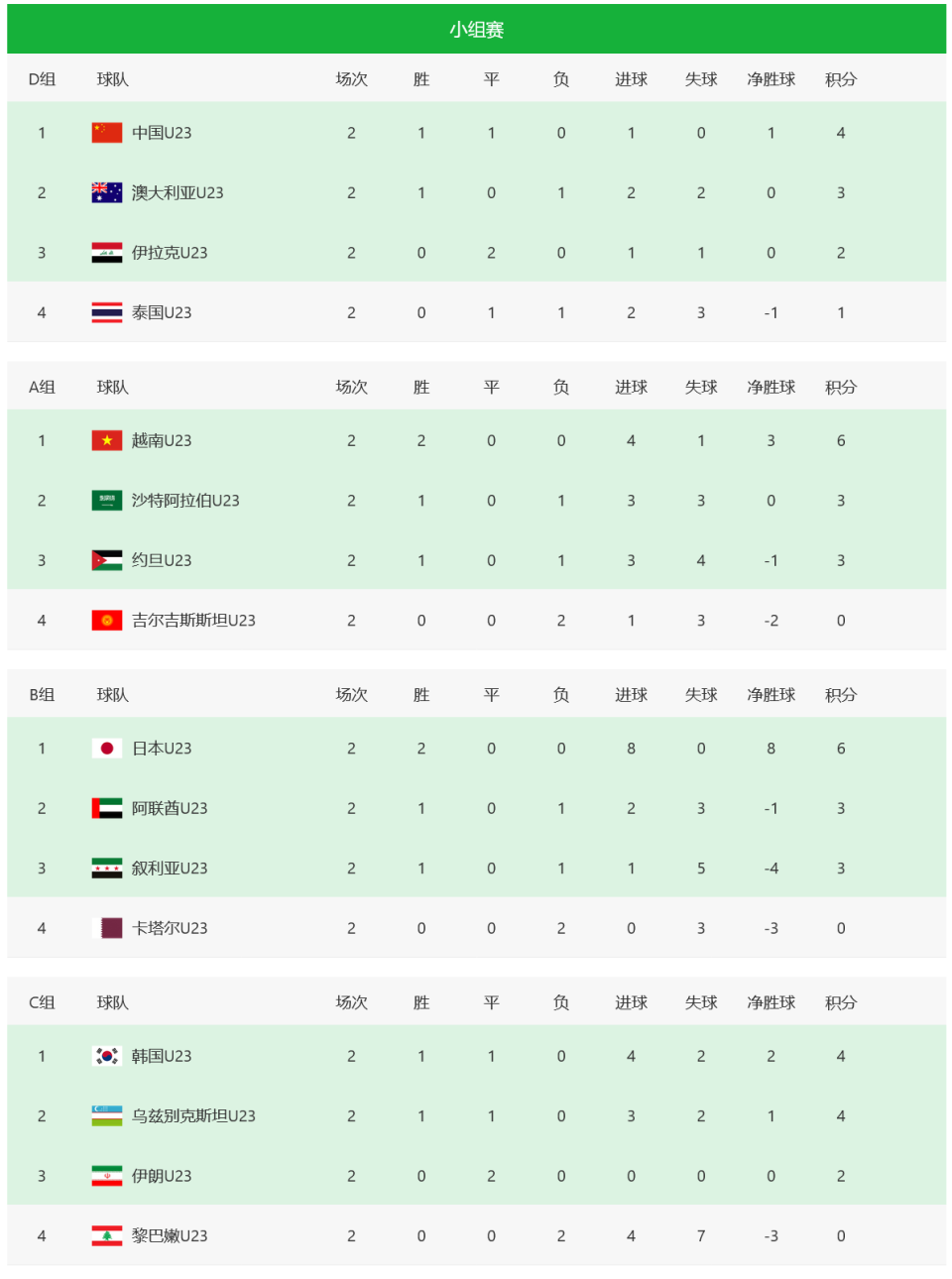 至此,A组前2轮比赛战罢,越南队2连胜领跑积分榜。末轮越南对阵沙特,因为同分优先比较相互战绩,而此前越南2-0击败约旦,那么越南队末轮净负沙特2球也能确保晋级。