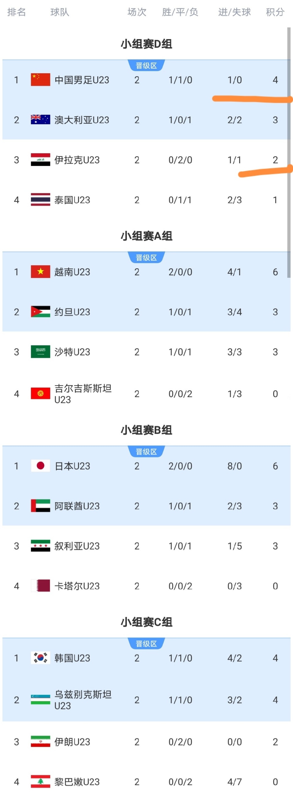 随着澳大利亚0-1,伊拉克1-1,亚洲杯最新积分榜:U23国足稳居第一