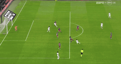 拉菲尼亚选择自己射门,琼阿梅尼防守不及,皮球打进远角,巴萨取得领先。