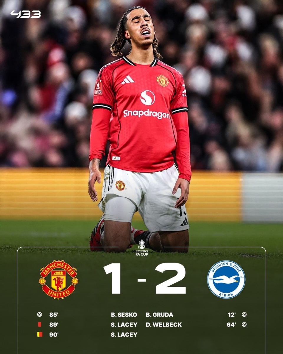 足总杯第3轮,曼联1-2不敌布莱顿,一轮游出局。达洛特错失单刀,格鲁达帮助布莱顿取得领先,拉门斯后场送礼险些丢球,维尔贝克爆射破门弑旧主,舍什科头球扳回一城,小将莱西90分钟砸球发泄,两黄变一红被罚下。
