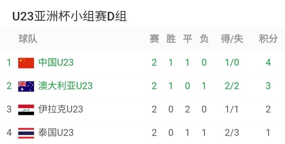 今天凌晨,U23亚洲杯小组赛第二轮最后一场比赛结束,泰国队1-1逼平了伊拉克队,而这场比赛也是关乎中国队晋级的形势。在这场比赛结束之后,中国队所在的D组积分榜发生较大变化。