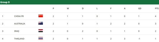 不过下半场,替补登场的钦恭·普东永在第85分钟混战捅射破门,帮助泰国队1-1绝平伊拉克。因此,中国队在前两轮结束之后以4分单独在D组领跑,澳大利亚队3分排在第二,伊拉克队2分位居第三,泰国队1分垫底。