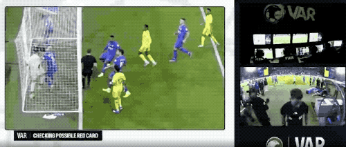 利雅得新月球员冲进球网抢球,阿奇迪对内维斯有一个附加的动作,VAR介入,裁判做出改判,直接将阿奇迪红牌罚下。