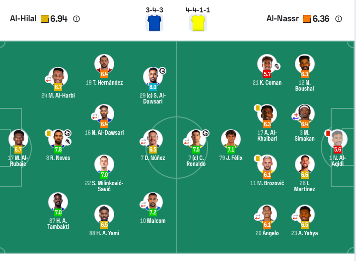 利雅得胜利首发:1-阿奇迪、12-纳瓦夫、26-伊尼戈·马丁内斯、3-西马坎(72’19-哈桑)、23-叶海亚(83’2-哈纳姆)、11-布罗佐维奇、17-哈巴利、20-安吉洛(62’61-布埃纳因)、21-科曼、79-菲利克斯、7-C罗(83’80-韦斯利)。