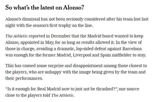 第二是欧冠连遭重创。在欧冠赛场,皇马先后以0-1负于当时在英超挣扎的利物浦,又在主场领先的情况下被曼城2-1逆转。对阵曼城赛后,媒体普遍认为阿隆索的 “未来似乎已经看到了尽头了”。