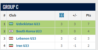 在C组积分榜上,乌兹别克斯坦以7分排名榜首,韩国以4分排名第2位,黎巴嫩、伊朗分别以3分、2分排名第3、4位。在八强战里,乌兹别克斯坦将对阵D组第二名,而韩国将对阵D组第一名。