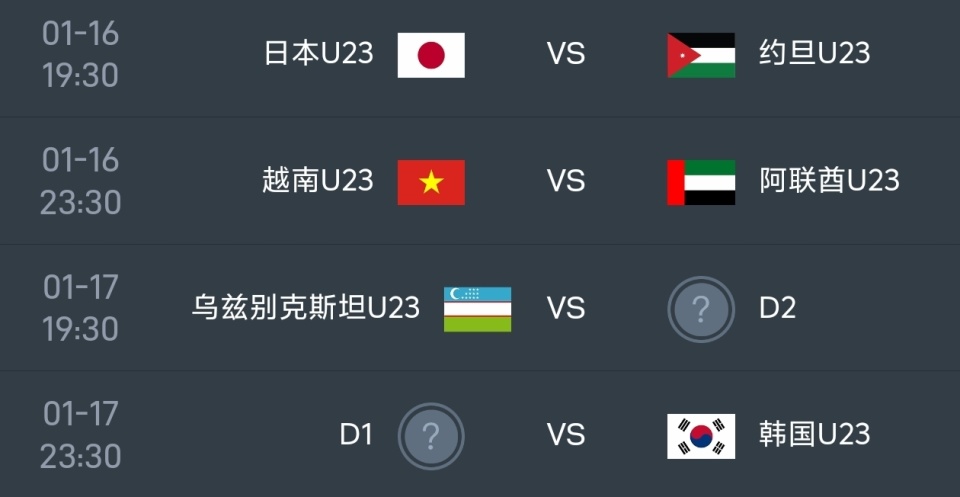 两组四分之一决赛对阵也已确定:日本队将对阵约旦,越南将迎战阿联酋。