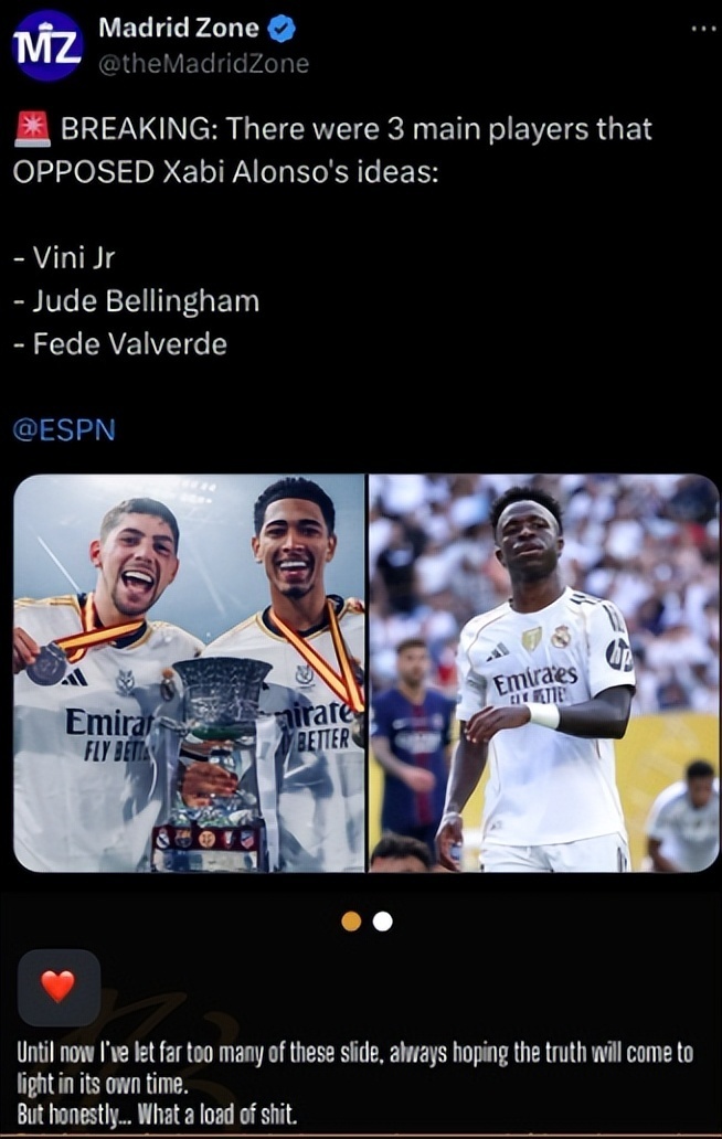 而贝林厄姆则在个人社交媒体上对此予以否认,贝林厄姆表示:“这纯属一派胡言……别轻信你读到的所有东西,让这帮为了博眼球、炒热度,散布这种具有破坏性的人为虚假信息而负责。”