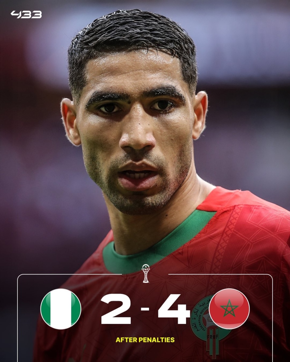 另一场半决赛,摩洛哥淘汰尼日利亚晋级非洲杯决赛,决赛将迎战塞内加尔。双方90分钟均无建树,加时赛阿格德中柱。最终通过点球大战,布努两次扑出点球。