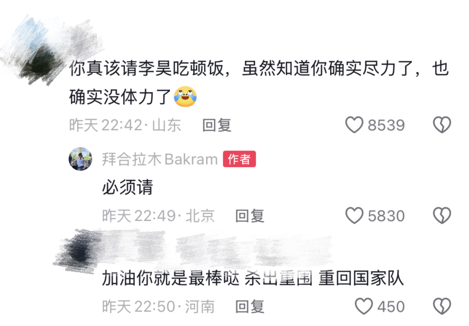 赛后拜合拉木在社媒发布与队友、教练的多张合影,全队都很开心、兴奋。许多球迷在评论区调侃拜合拉木,说他真应该请李昊吃顿饭,拜合拉木回复道:“必须请”。显然,拜合拉木也对自己的失误捏了一把汗,真是多亏李昊了。如果拜合拉木的这次头球真的转变为了乌龙球,导致国足被淘汰,可以想象到拜合拉木的处境会是多么糟糕,他肯定会很自责,可以想象到他的风评会有多差。