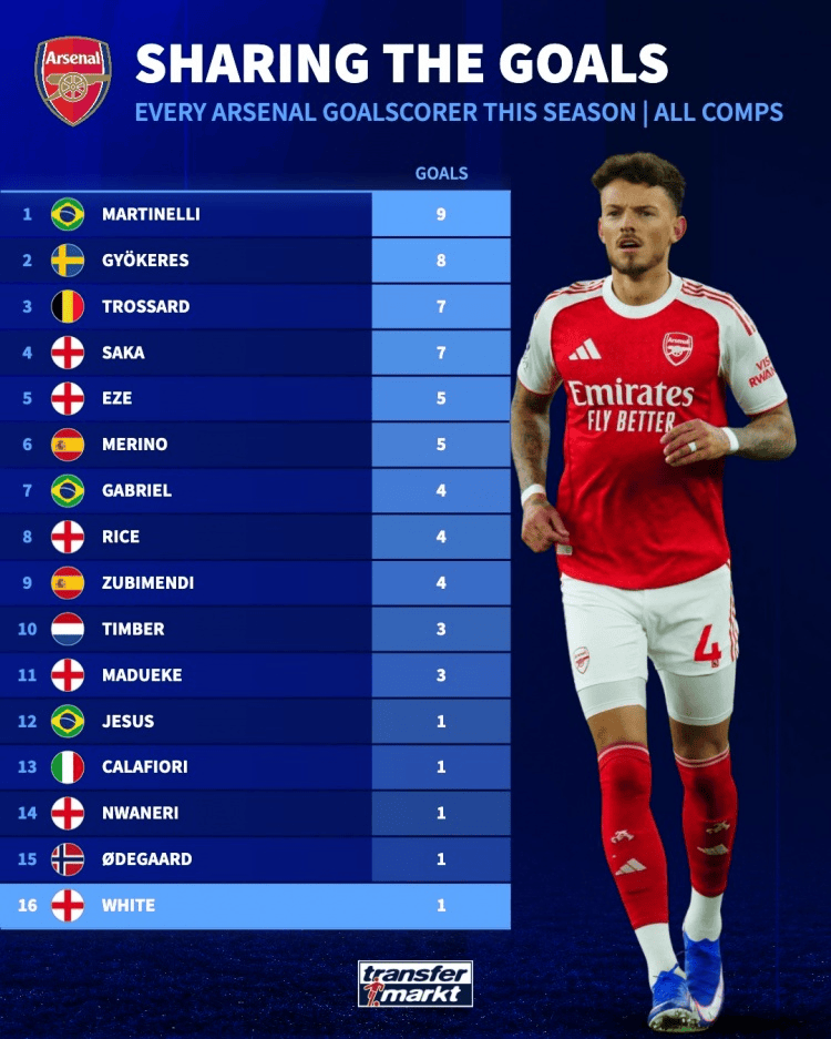 阿森纳本赛季队内已有16名球员取得进球,马丁内利进9球最多