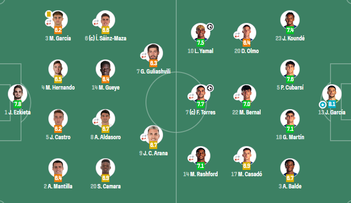 巴塞罗那(4-3-3):霍安-加西亚;孔德,库巴西,赫拉德-马丁,巴尔德;奥尔莫(67'佩德里),贝尔纳尔(58'费尔明),卡萨多(85'埃里克-加西亚);亚马尔,费兰-托雷斯(67'莱万多夫斯基),拉什福德(67'拉菲尼亚)