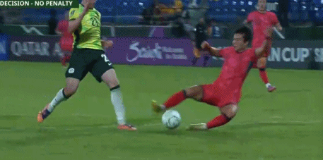 从慢镜头来看,姜民俊双脚放铲,但两只脚都没有铲到对手,麦考利斯特存在假摔嫌疑。回看慢镜头之后,傅明做出改判,取消了点球。值得一提的是,除了做出飞铲动作之外,姜民俊倒地之后还左手触球。
