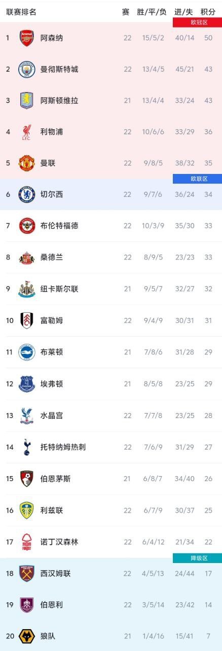 虎扑01月17日讯 英超第22轮的7场比赛已经结束,积分榜的形势出现新的变化。