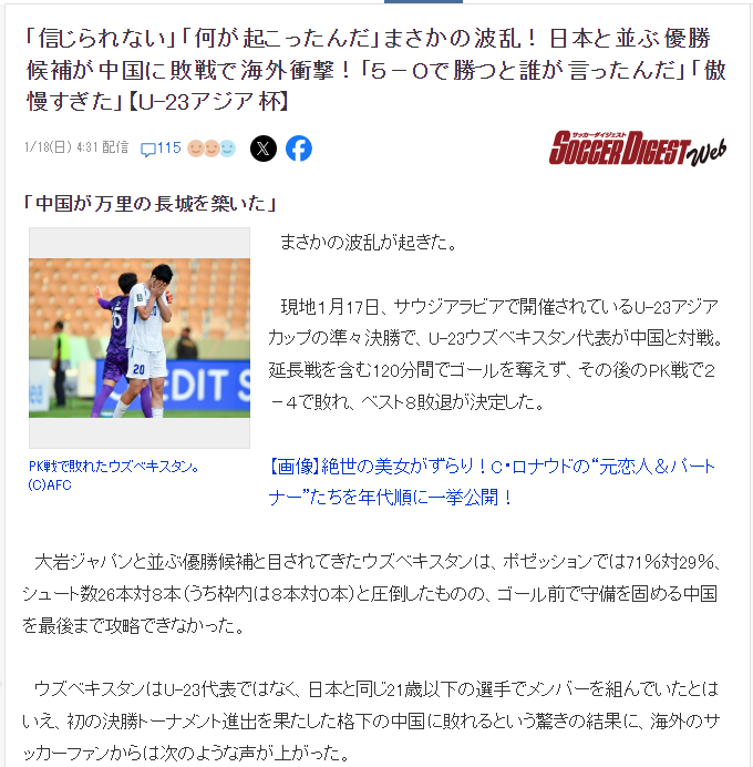《足球文摘网》以《“难以置信”!“发生了什么”? 爆冷大逆转!与日本队并列夺冠热门的球队,竟不敌中国队,这一结果令海外舆论哗然!“是谁说能 5-0 大胜的?”“实在是太傲慢了”》为题进行了报道,文章称,当地时间1月17日,在沙特举办的2026年U-23亚洲杯八分之一决赛中,乌兹别克斯坦队迎战中国队。双方在包括加时赛在内的120分钟里均未能破门,随后的点球大战中,乌兹别克斯坦以2-4告负,止步八强。