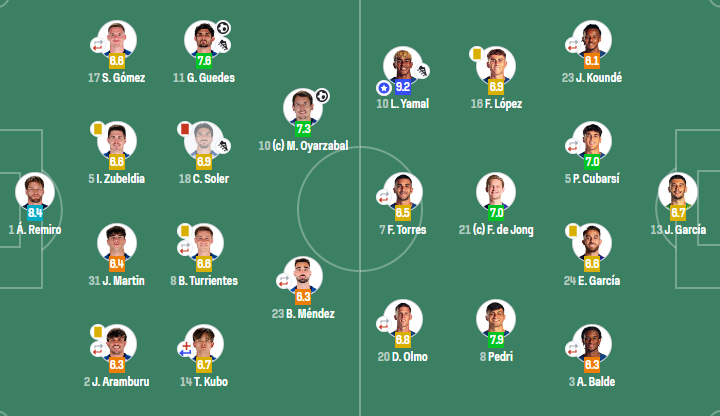 巴塞罗那(4-3-3):霍安-加西亚;孔德(85'巴德吉),库巴西(85'赫拉德-马丁),埃里克-加西亚,巴尔德(62'坎塞洛);费尔明,德容,佩德里;亚马尔,费兰-托雷斯(62'莱万多夫斯基),奥尔莫(62'拉什福德)