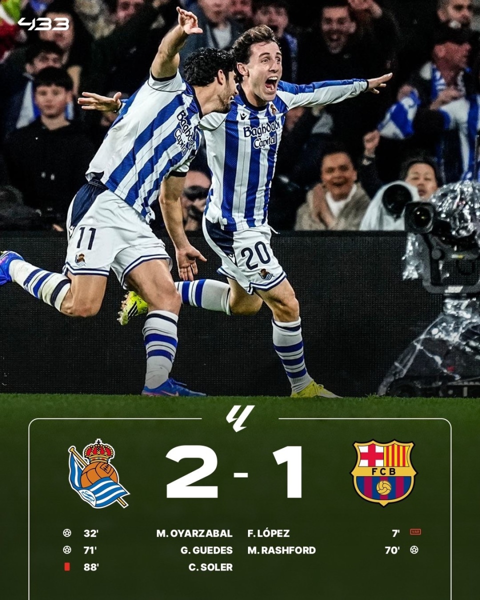 西甲第20轮,巴萨客场1-2不敌皇家社会,只领先皇马1分。奥亚萨瓦尔被吹后再次进球,费尔明、德容、亚马尔三球被吹,亚马尔点球也被取消,奥尔莫、孔德中柱,拉什福德破门,格德斯建功,久保建英伤退,索莱尔飞铲佩德里直红。
