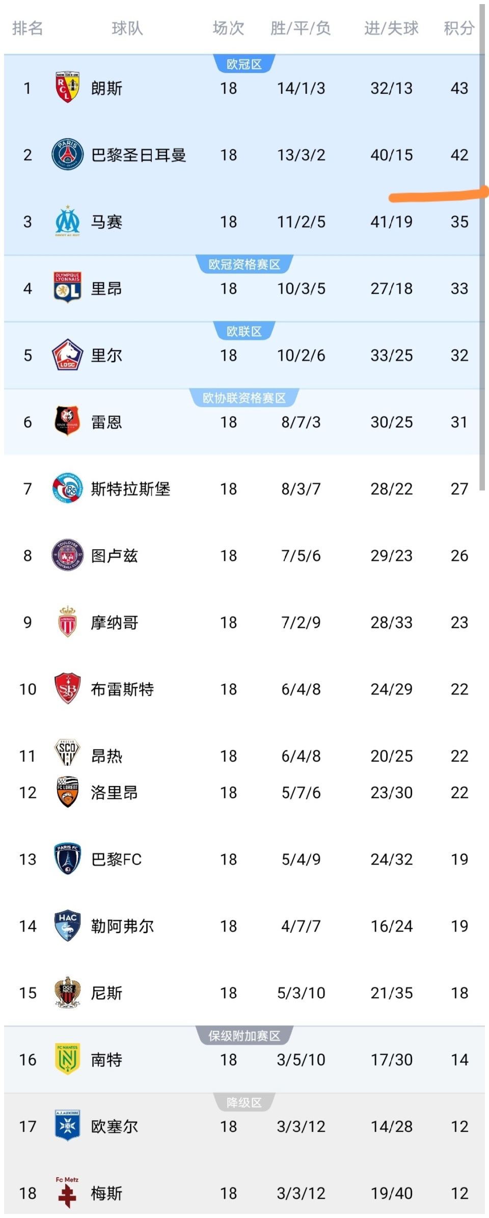 可以看到里昂击败布雷斯特之后,积分上涨到了33分,仅差第3的马赛2分,里昂已经逼近了欧冠席位区,恩德里克的到来,显然会让里昂如虎添翼,争夺前三的希望大增了。斯特拉斯堡击败梅斯之后积分上涨到了27分,距离前六分差是4分。而巴黎FC击败南特之后,积分上涨至19分,领先降级区7分,巴黎FC保级希望大增。此外可以看到领头羊依然是朗斯,而巴黎圣日耳曼队落后1分。